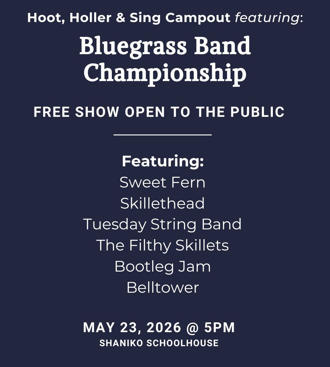 +Sat, May 23rd: Bluegrass Band Championship @ 5pm at the Shaniko Schoolhouse, featuring: Sweet Fern, Skillethead, Tuesday String Band, The Filthy Skillets, Bootleg Jam, and Belltower